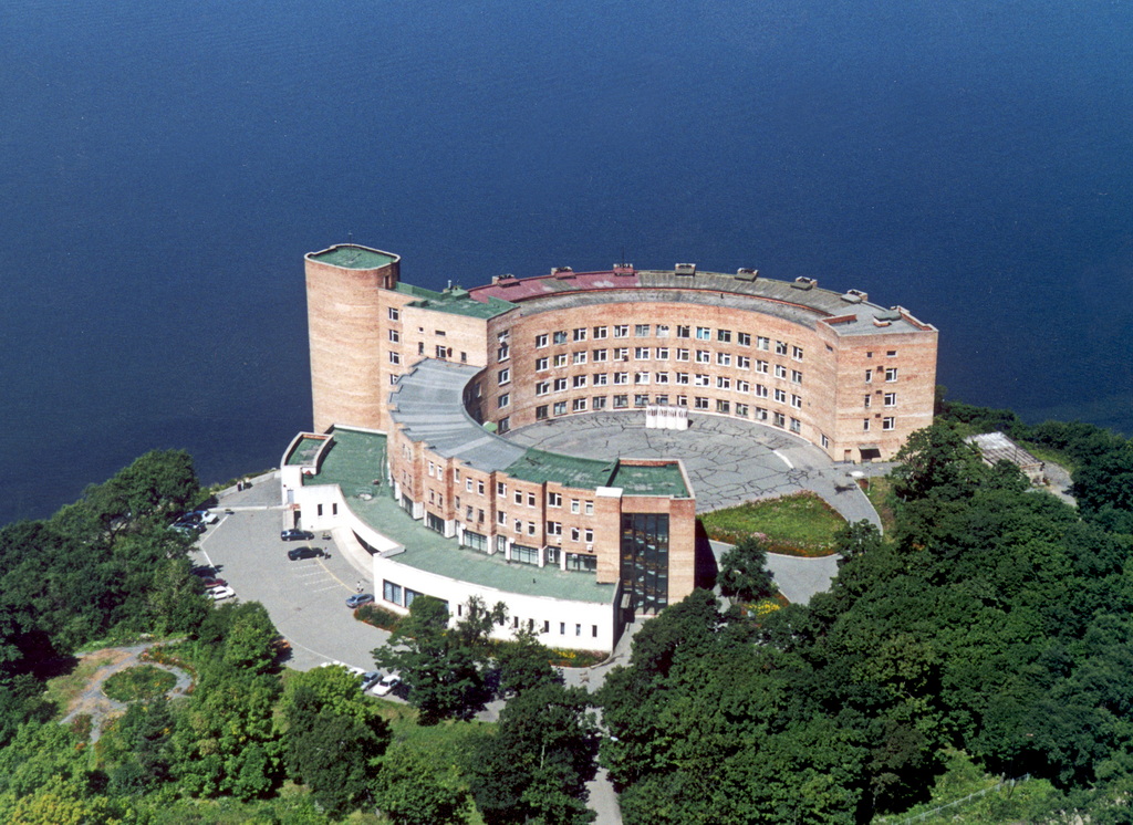 «Здание решено в двух главных уровнях – верхнем, где размещены помещения главного корпуса института, и нижнем с площадками, эллингами, складами, мастерскими и т.д. Оба уровня связаны вертикальной шахтой с лифтами, лестницей и коммуникациями. Кольцеобразное решение главного корпуса отвечает розе ветров и местоположению корпуса на генплане» (журнал «Архитектура СССР», 1990/4).