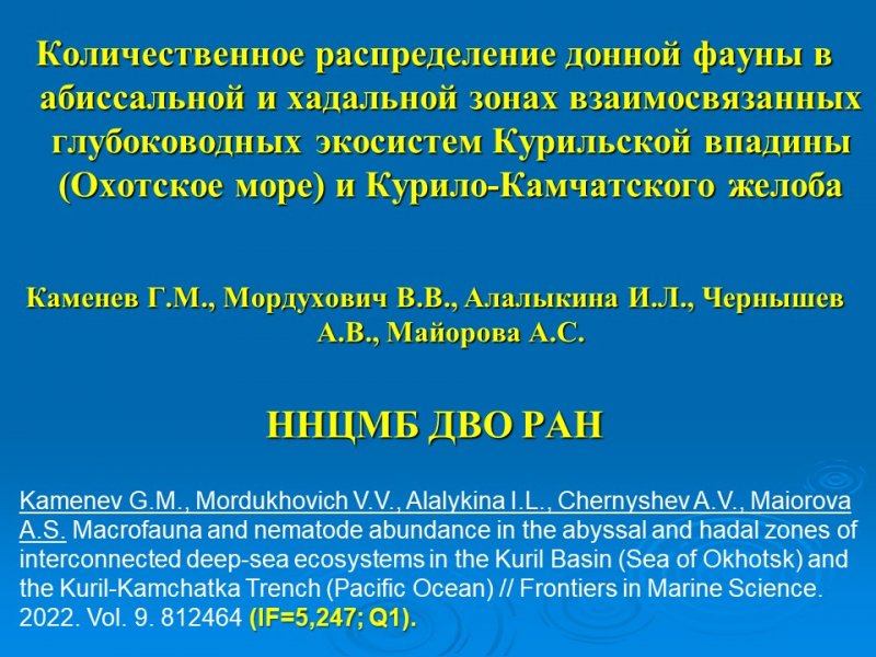 Не менее значимы результаты исследования самых глубоководных донных экосистем северо-западной Пацифики, представленные научными сотрудниками Лабораторий динамики морских экосистем и эмбриологии. Ими было показано, что на дне Курило-Камчатского желоба (глубина более 9500 м) количество донных животных оказалось в 7 раз выше, чем ранее было зарегистрировано. На количественное распределение донной фауны Курильской впадины (Охотское море) и Курило-Камчатского желоба наибольшее влияние оказали три параметра окружающей среды из 17, рассмотренных в данном исследовании. Также, было отмечено, что в функционировании глубоководных экосистем Охотского моря и Курило-Камчатского желоба большое значение имеет органическое вещество, полученное в результате хемосинтеза.