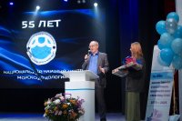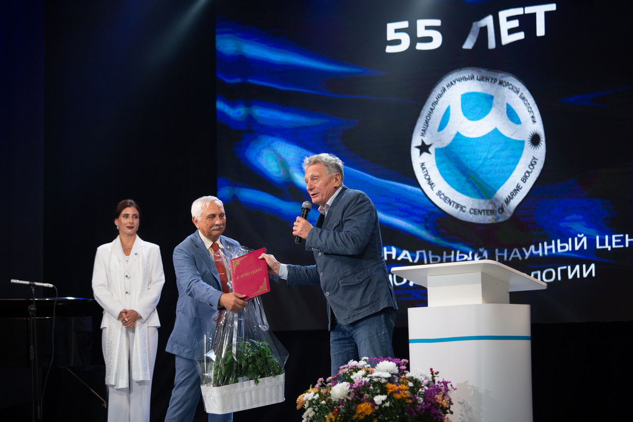 Коллектив ННЦМБ ДВО РАН далее поздравил руководитель Тихоокеанского филиала ГНЦ РФ ФГБНУ «ВНИРО» («ТИНРО») Алексей Байталюк. Алексей Анатольевич вручил поздравительные адресы от Директора и коллектива ГНЦ РФ ФГБНУ «ВНИРО», отметил в своем выступлении, что в эти сентябрьские дни отмечается и 100-летний юбилей ТИНРО, и подчеркнул - наши ученые 55 лет вместе! Алексей Анатольевич рассказал о тесной связи ученых-прикладников и ученых академической науки. Обращаясь к директору ННЦМБ ДВО РАН чл.-корр. РАН Игорю Долматову, и ко всему коллективу Научного центра, он подчеркнул: «Научно-производственная деятельность ННЦМБ ДВО РАН ‒ это важная часть истории развития науки на Дальнем Востоке России. Создание в 1970 году Института биологии моря ДВО РАН расширило возможности отечественных комплексных исследований дальневосточных морей и Тихого океана, объединённых общей целью ‒ обеспечить экономическое развитие Дальнего Востока». А.А. Байталюк выразил уверенность в сохранении добрых традиций взаимодействия и дальнейшем успешном сотрудничестве, а коллегам из ННЦМБ ДВО РАН пожелал крепкого здоровья, благополучия, дальнейших успехов в фундаментальных, поисковых и прикладных научных исследованиях в области морской биологии, биотехнологии и смежных наук, бодрости духа и новых славных юбилеев! «Я бы хотел вручить вам настенную плакетку, где написано первое слово – ДРУЗЬЯМ!», - завершил свое выступление А.А. Байталюк.
