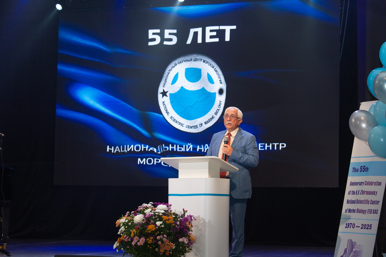 Завершили Торжественное собрание поздравлением академика РАН Владимира Васильевича Малахова, работавшего в Институте биологии моря ДВО РАН в период 1982-1985 г.г., автора и соавтора многочисленных научных публикаций с учёными ННЦМБ ДВО РАН, Учителя академика РАН А.В. Адрианова: «Дорогие коллеги, Поздравляю вас с 55-летним юбилеем нашего Института биологии моря, ныне Национального научного центра морской биологии имени А.В. Жирмунского. Прошу передать коллективу Института поздравления и от меня, и от всей нашей кафедры — кафедры зоологии беспозвоночных МГУ. Жизнь идет вперед, все меняется, но как огромный маяк светит центр российской морской биологической науки на наших богатейших Дальневосточных морях. Свет этот привлекает научные силы со всей России, свет этот доходит до самых дальних уголков нашей планеты, его знают и видят морские биологи во всем мире. Пусть же этот свет не гаснет никогда! Институт биологии моря сыграл важную роль в моей жизни, может быть, самую главную роль. В стенах Института я нашел свое личное счастье, Институт принял моих лучших учеников, которые сделали в его стенах выдающуюся научную карьеру, наша кафедра по-прежнему активно сотрудничает с Институтом биологии моря. Страшно представить, но я впервые побывал в Институте в 1971 г. Немного осталось на земле тех, кто помнит Институт того времени и «Восток» того времени. В этот день, день 55-летнего юбилея, вспомним тех, кто отдал свои силы Институту биологии моря. Здоровья и сил живым и вечная память ушедшим. Дорогие ИБМ-вцы, в день праздника вспомните Владимира Васильевича Малахова и Любу Медведеву, старшее поколение нас помнит, а мы вас не забываем никогда. С пожеланиями развития и процветания, Ваш Малахов».