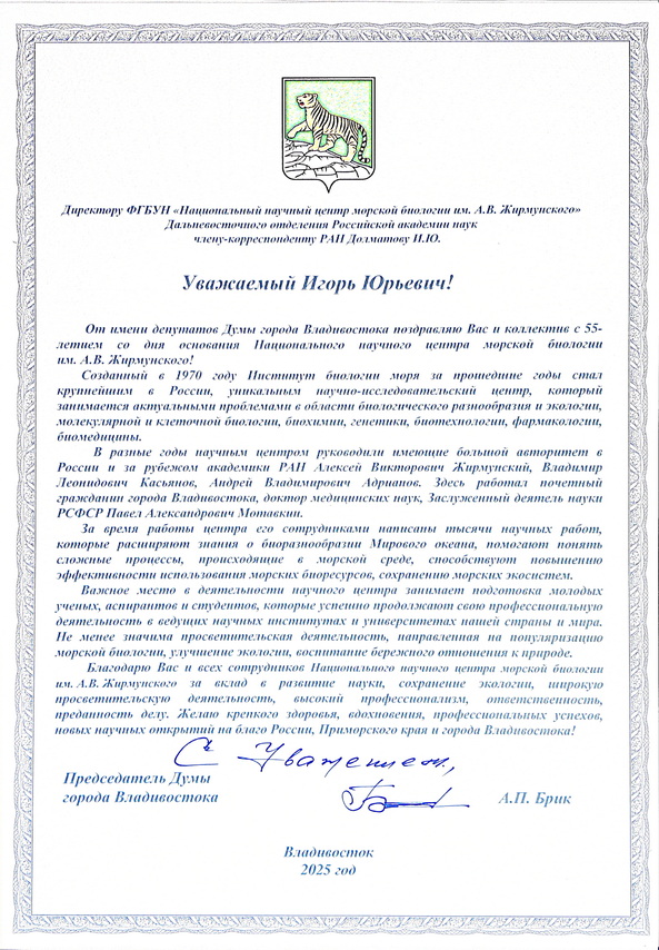 С приветственным словом выступил Глава Думы г. Владивостока А.П. Брик. «Поздравляю вас от имени Думы и от себя лично с Юбилеем! Для каждого человека, для каждого жителя нашего города, Приморского края, и, конечно же, для каждого из сотрудников это юбилей имеет важное значение, когда мы говорим, что 55 лет – а это целая эпоха для этого уникального научного Центра, эпоха изучения Биологии моря! И слово «Национальный» еще раз подчеркивает его значимость. Это говорит о том, что на его сотрудников возложена очень важная задача. Вы все слышали, и не раз, что Океан – самая не изученная часть нашей планеты, а вы занимаетесь его изучением, а это значит, что в ваших руках – будущее», - отметил Андрей Петрович. «Спасибо Дальневосточной академии наук, Юрию Николаевичу Кульчину, которое поддерживает ваш Центр и такие мероприятия, на которых мы сегодня находимся. Дальневосточное отделение академии наук сегодня стоит на передовых позициях и создает ландшафт науки на Дальнем Востоке России, это и тысячи научных работ, изданий, и, конечно же, заслуженные люди, которые работают в этом коллективе. Разрешите поздравить вас, дорогие друзья, еще раз от себя и от имени всех депутатов Думы г. Владивостока с этим замечательным праздником! Пожелать вам хочу успехов профессиональных, роста во всех научных направлениях, низкий вам поклон, слова благодарности и самые теплые слова», - заключил А.П. Брик. К учёным Центра-юбиляра Андрей Петрович приехал с персональными благодарностями, вручив ведомственные награды заслуженным работникам Центра – М.А. Ващенко, Ю.К. Зограф, Е.Е. Костиной.